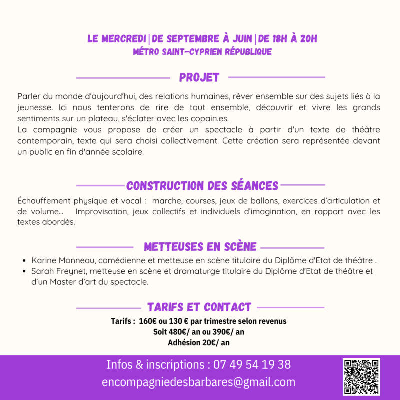 La compagnie vous propose de créer un spectacle à partir d'un texte de théâtre contemporain, texte qui sera choisi collectivement. Cette création sera représentée devant un public en fin d'année scolaire.